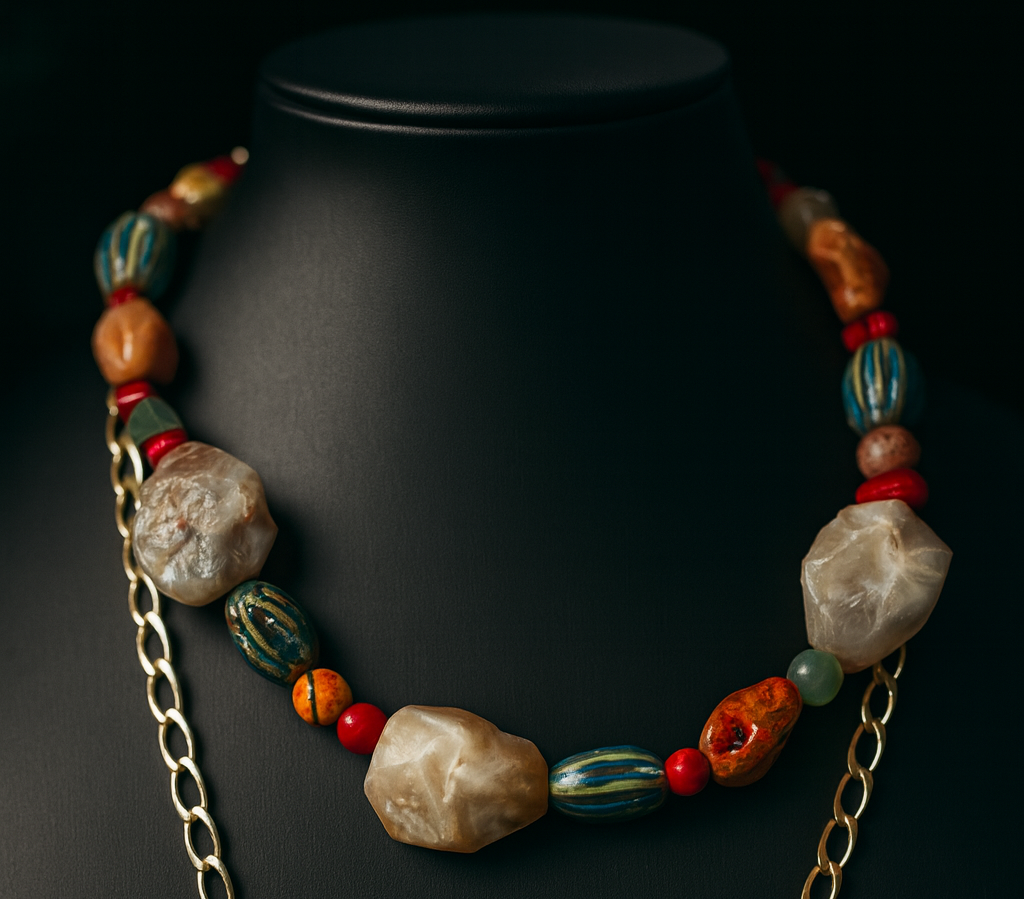 Este collar único combina la fuerza y belleza de la naturaleza con un diseño sofisticado. Hecho a mano en Chile, destaca por sus piedras naturales en tonos tierra, rojo intenso, azul y verde, que se entrelazan con tres piedras centrales en acabado crudo.
