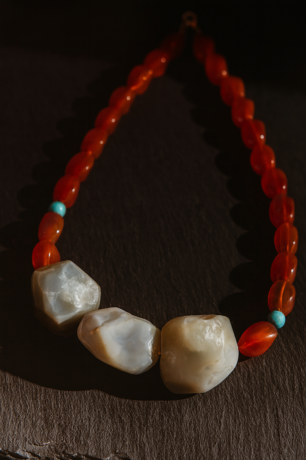 Un diseño único que combina piedras rojas de ágata, detalles turquesa y tres piedras centrales en tono blanco natural. Hecho a mano, cada pieza es irrepetible, resaltando la belleza de las texturas y colores auténticos de la naturaleza.