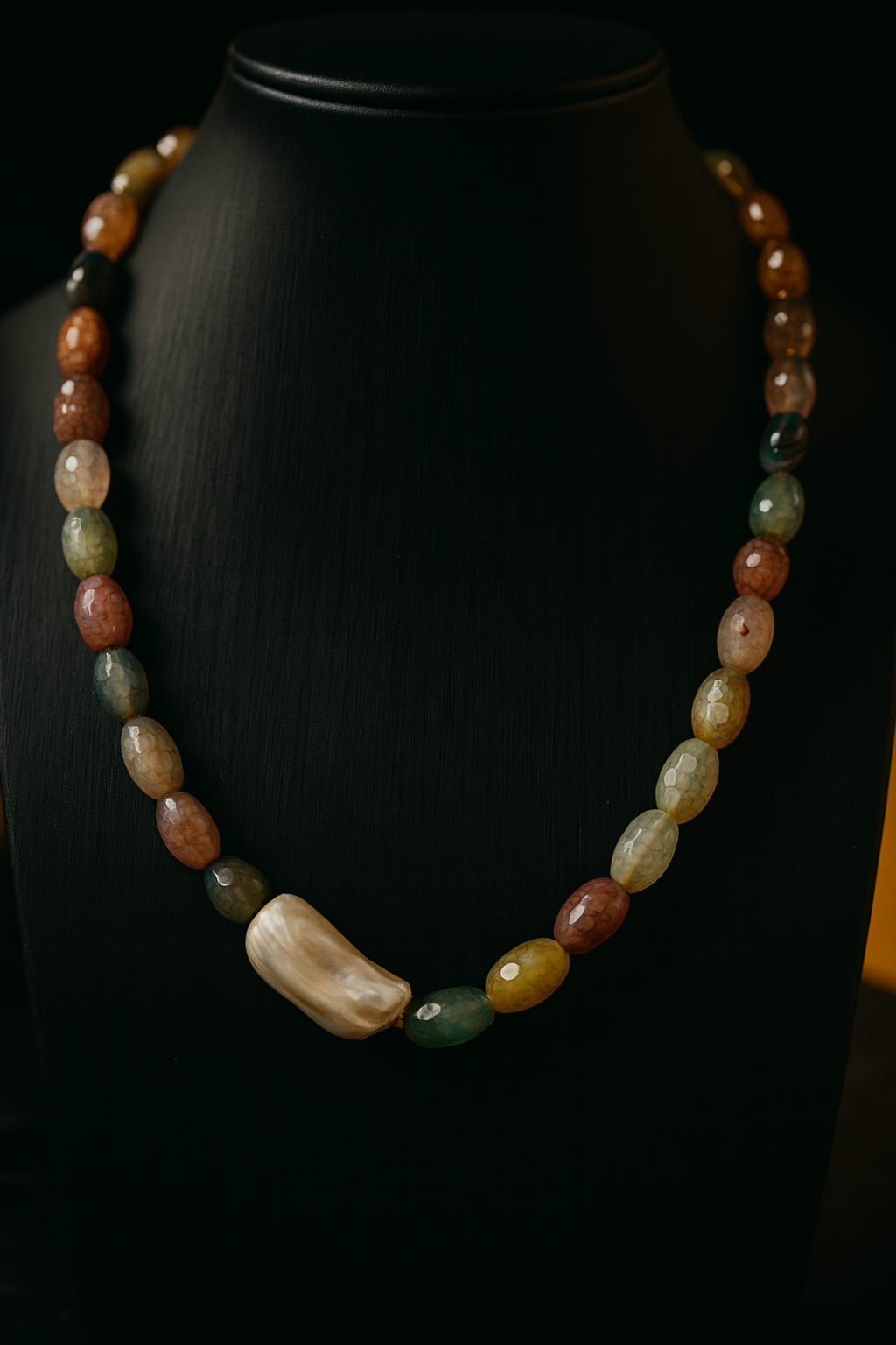 Un diseño único que fusiona la calidez de las Ágatas naturales en tonos de la sandía, con detalles vibrantes en verde y destellos dorados. Cada pieza ha sido seleccionada cuidadosamente para crear un equilibrio entre elegancia y estilo bohemio. Su forma orgánica y el toque artístico del esmalte verde lo convierten en un accesorio distintivo, perfecto para realzar cualquier look con sofisticación y carácter.