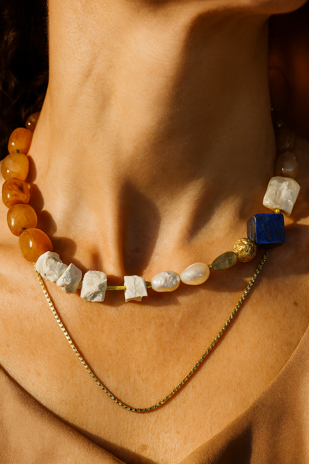 Cada detalle refleja el contraste de texturas y colores: el brillo profundo del lapislázuli, la suavidad de la perla, la transparencia luminosa de la cornalina y la esencia mística de las piedras en bruto. Un diseño equilibrado entre lo rústico y lo sofisticado, pensado para resaltar tu estilo propio.