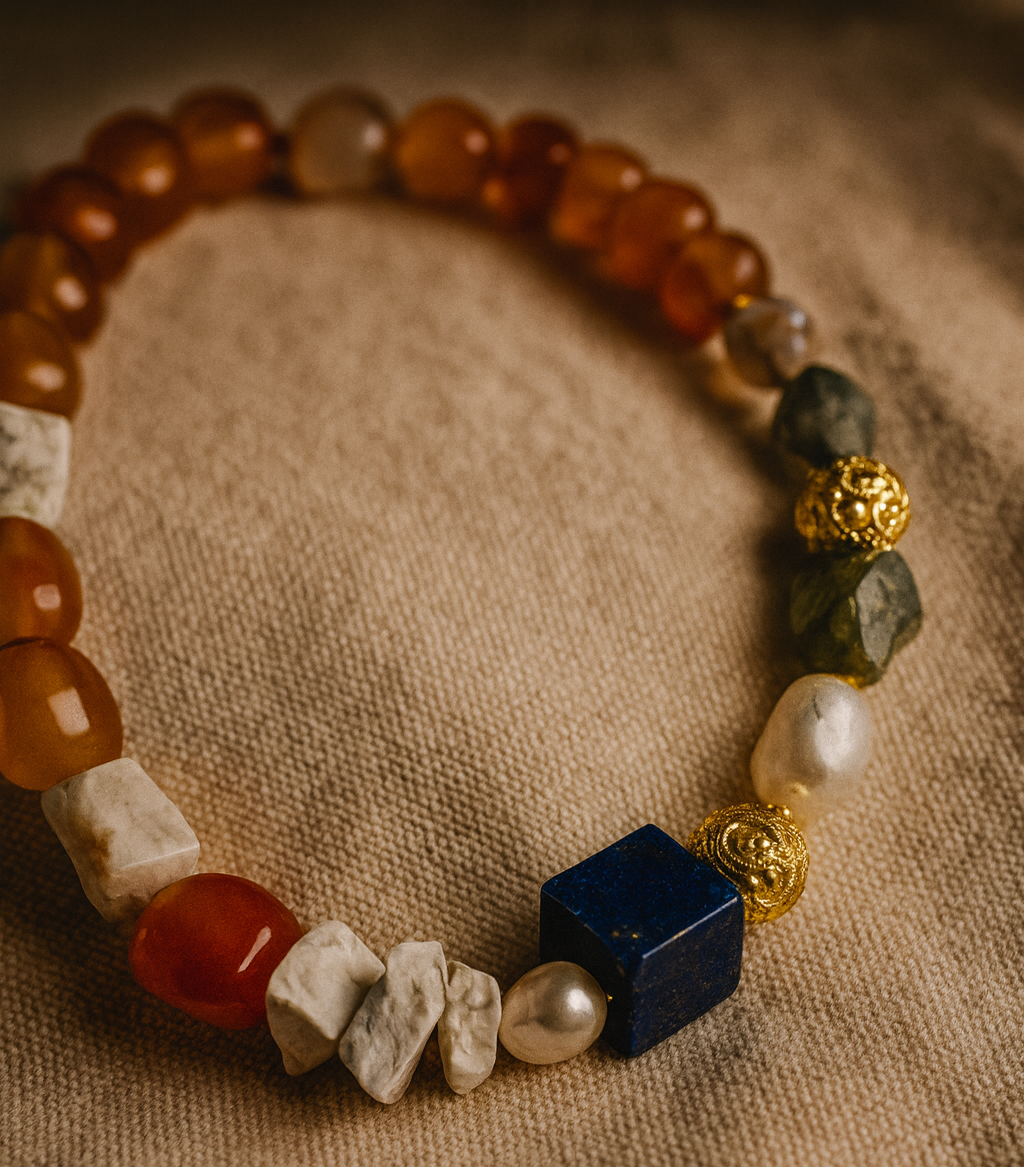 Una pieza de impacto y carácter, creada con cubos de lapislázuli natural en un azul intenso que simboliza sabiduría y protección. Cada piedra ha sido cuidadosamente tallada para mantener su esencia mineral, acompañada de un toque cálido de ágata caramelo y detalles dorados que realzan su elegancia.
